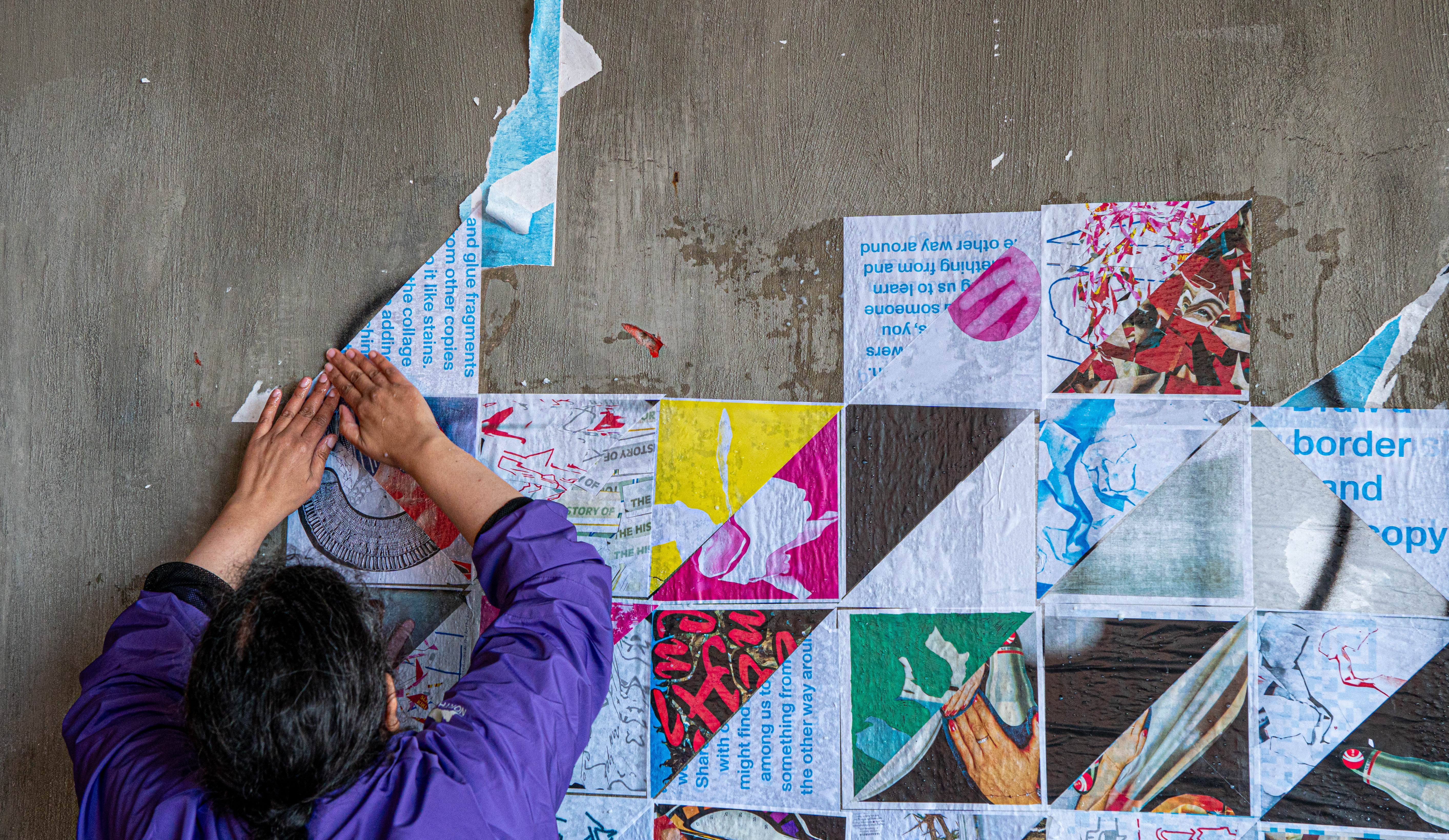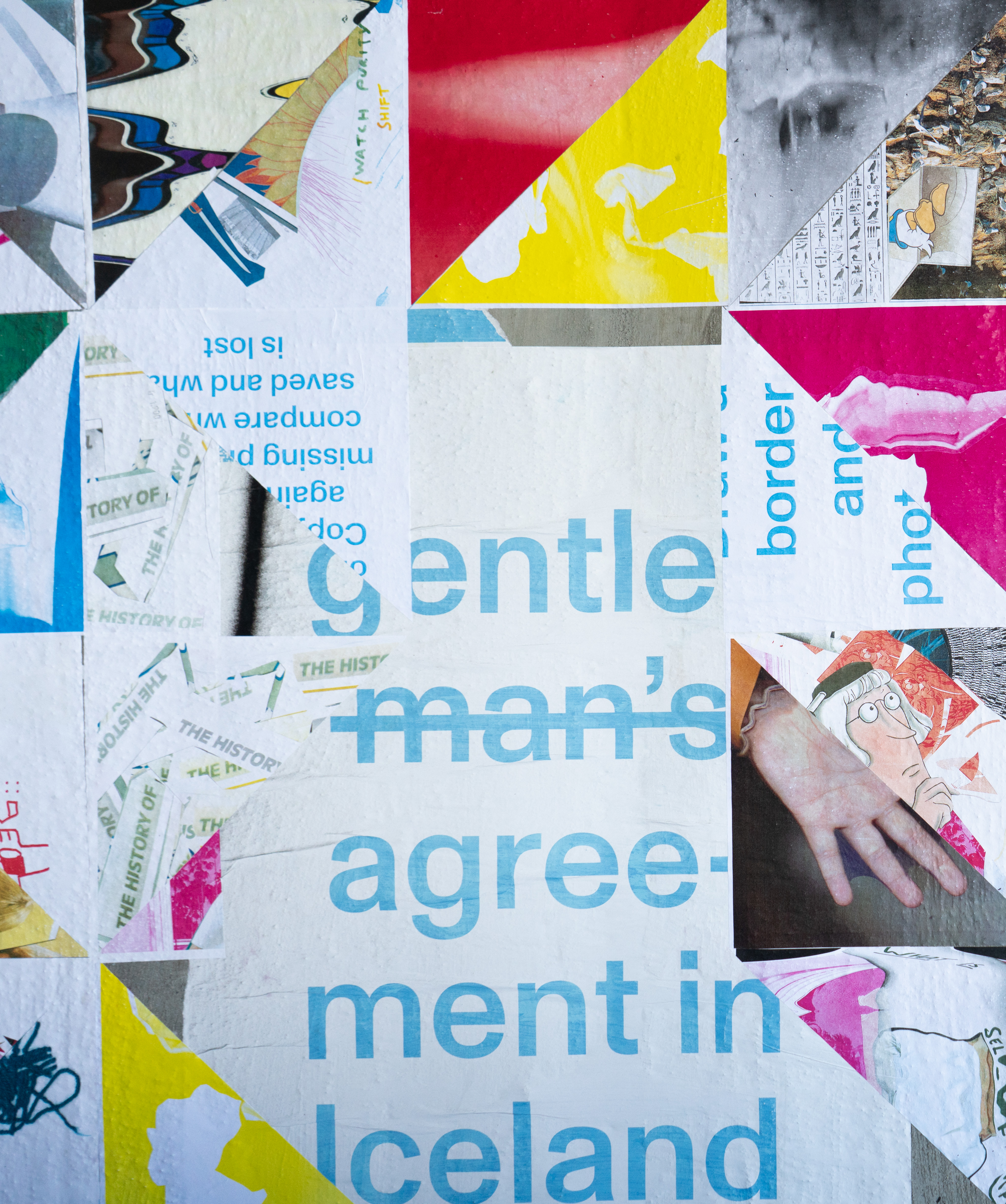 The second part reinterprets the “gentleman’s agreement” as a gentle agreement—a public commitment grounded in mutual accountability. In collaboration with the Hamraborg Festival (2024–2025), this took shape through a handshake ceremony that opened months of dialogue between me and the festival about how such commitments could take form in practice. These conversations led to We Carry the Sun, a three-day workshop at the Kópavogur Library and Molinn Youth Center. With Bryndís Björnsdóttir, Mariana Murcia, and Deepa R. Iyengar, we explored belonging and difference through printmaking, collage, and copy-machine experiments. The resulting works formed a collective wheatpaste mural in the Hamraborg parking garage.