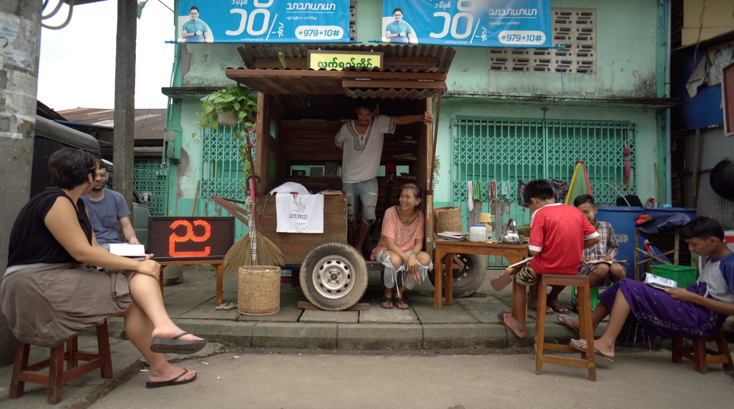 Social sculpture. 2018. 5' x 3' x 7'; the swivel door extends the space by 3'. Steel, teak, corrugated sheet, solar power system (24V-200W), LED sign, public address system (with digital delay), furniture. In collaboration with the anarchist art collective called Noise in Yangon, I led the from-scratch construction of a mobile artist-run community center on a pushcart. This autonomous, interactive space—that we call Tea Shop—has a simple motto (translated into English): “Free to use by all (in cost and content). No red tape, no exclusion, and no power bill (we use solar energy).” Outside the reach of state censure, this in-progress project uses social sculpture to implicitly engage issues of land-use planning, neocolonialism and listening that is specific to the concerns of those in Yangon using it to creatively express themselves. Tea Shop can be easily morphed to accommodate many narratives and needs (concert hall, movie theater, vegan restaurant, translation center, makerspace, puppet theater, archive, meditation center, popup shop, or cellphone charging station). The included video documentation--or music video--shows the space being used as a micro library in the Yankin Township (with Rainfall Feminist Magazine; Myanmar Art Resource Center and Archive; SOCA; Gitameit Music Institute; Myanm/art; and Yangon Film School) and a village karaoke club in the Hmawbi Township (with students from New Zero's Art Village). This project was supported by an Asian Cultural Council Grant.